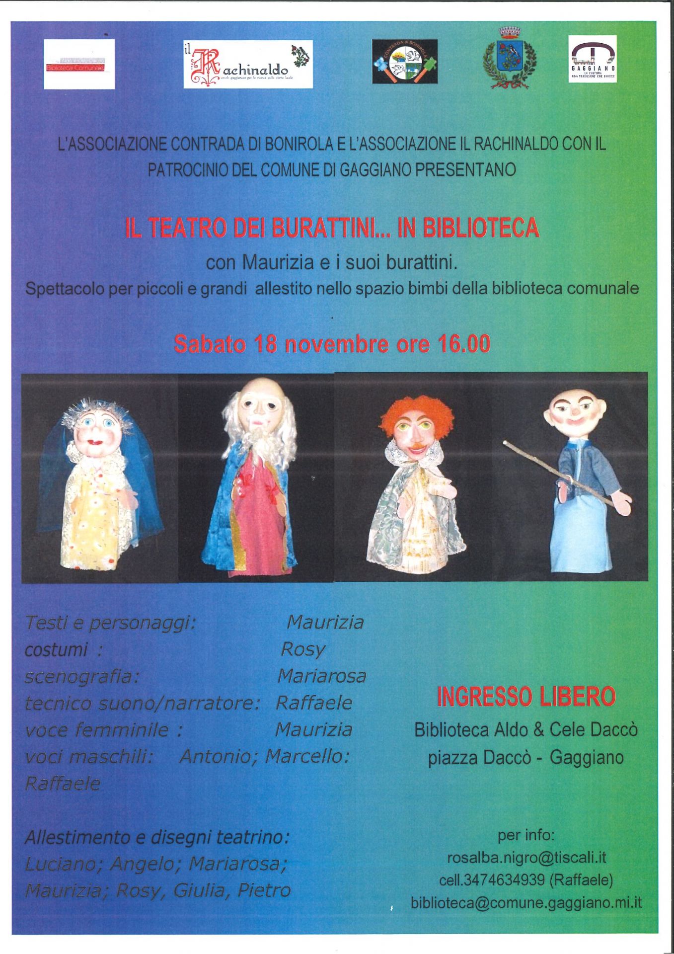 L'Associazione Il Rachinaldo propone uno spettacolo di burattini dal titolo "Storia dell'Ara bell'Ara" presso la Biblioteca Comunale Sabato 18 Novembre 2023 ore 16.00