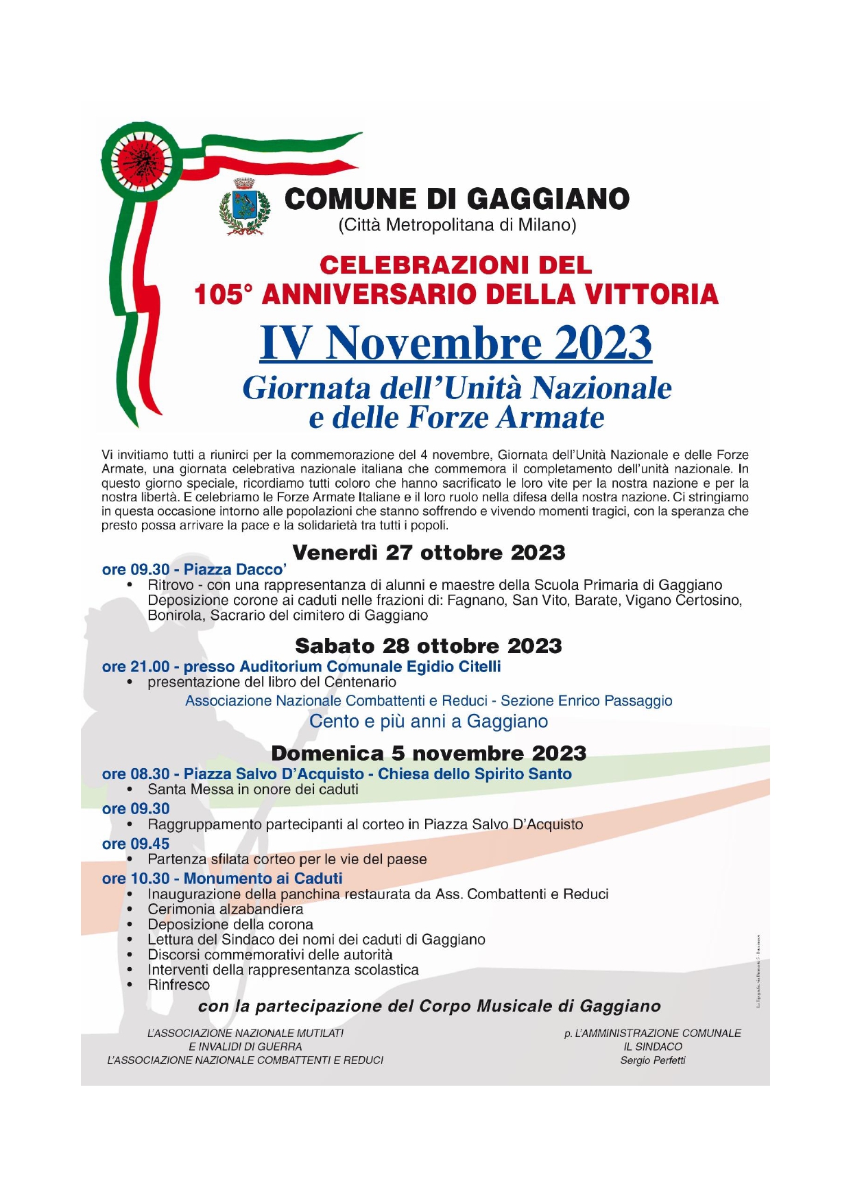 28 ottobre Presentazione libro "Cento e più anni a Gaggiano" a cura dell'Associazione il Rachinaldo - Centenario Associazione Nazionale Combattenti e Reduci - Sezione Enrico Passaggio con la partecipazione e del Corpo Musicale 1854 di Gaggiano