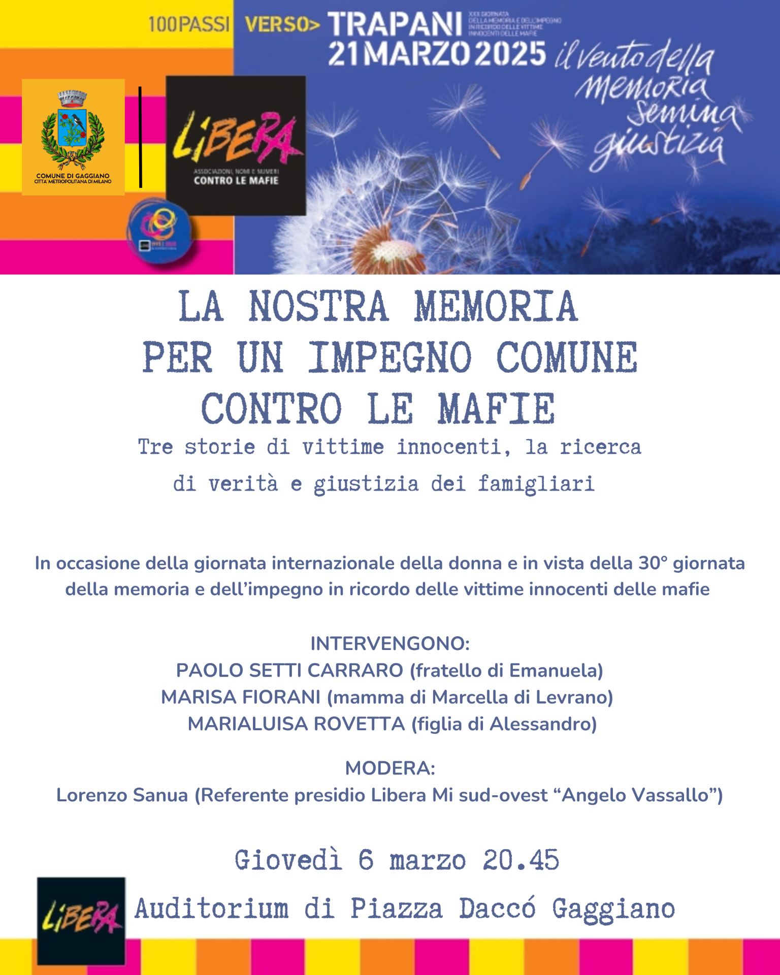Il Comune di Gaggiano organizza in collaborazione con l'Associazione Libera l’evento "La Nostra Memoria per un Impegno Comune Contro le Mafie".