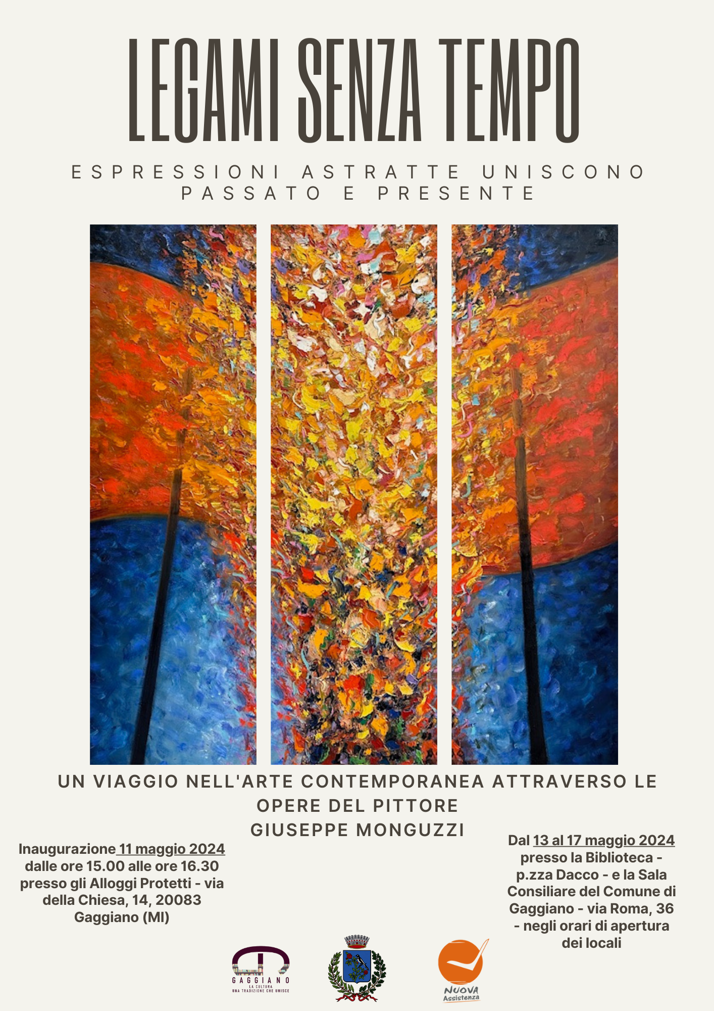 L'Assessorato alla Cultura e l'Assessorato ai Servizi Sociali organizzano, in collaborazione con la Nuova Assistenza, una mostra socio-culturale del pittore Giuseppe Monguzzi, artista gaggianese di rinomata fama per le innumerevoli mostre personali esposte regolarmente sia in gallerie private che in spazi pubblici.