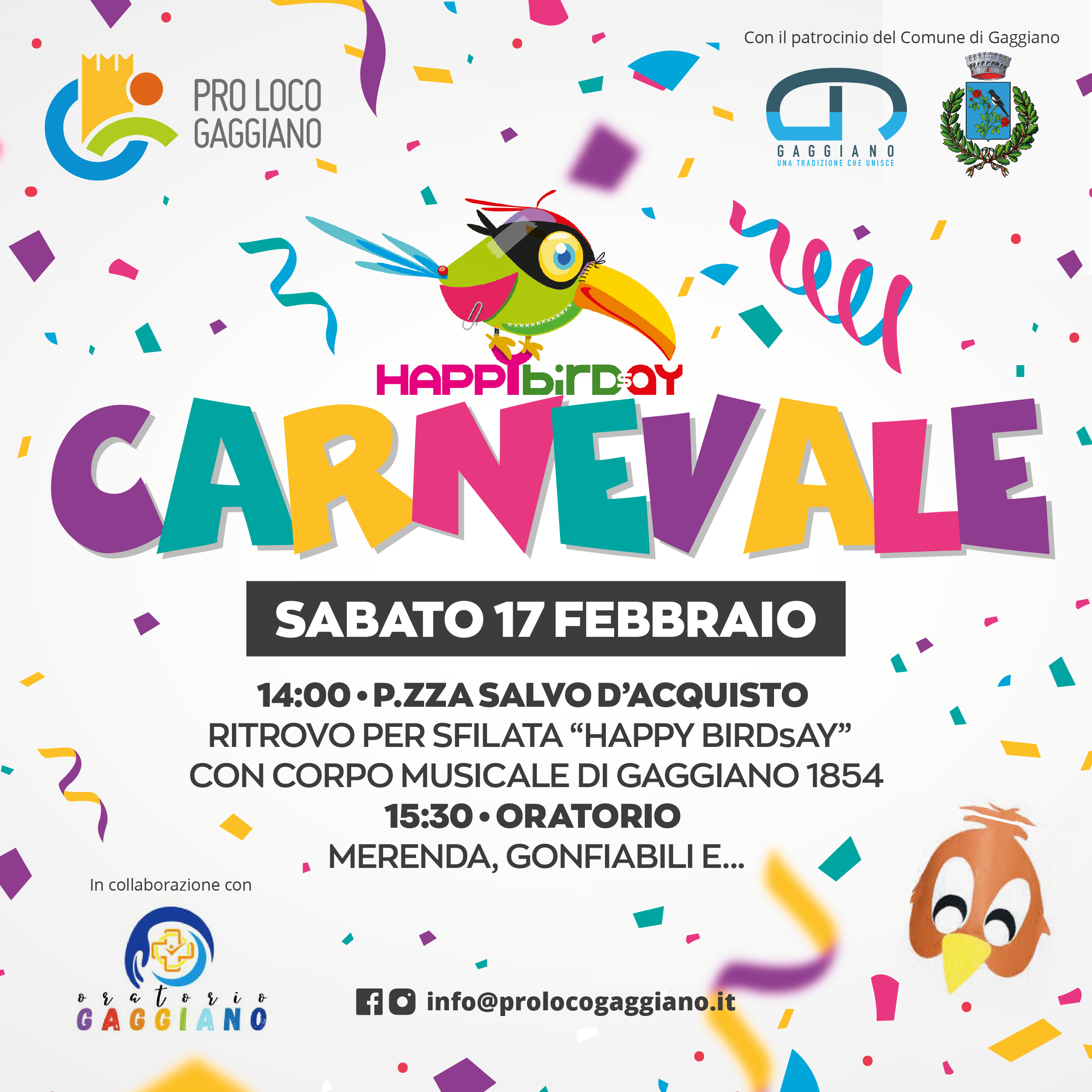 La Pro Loco di Gaggiano organizza in data 17 febbraio 2024 alle ore 14.00, Piazza Salvo D'Acquisto, una passeggiata mascherata per le vie del paese con l'arrivo in Oratorio.