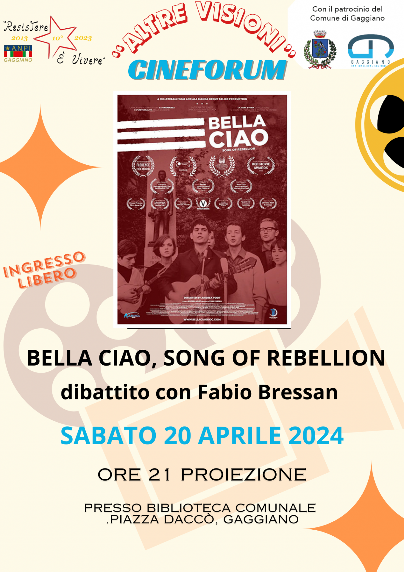 Sabato 20 Aprile 2024 alle ore 21.00 presso la Biblioteca Comunale cineforum "Bella ciao""