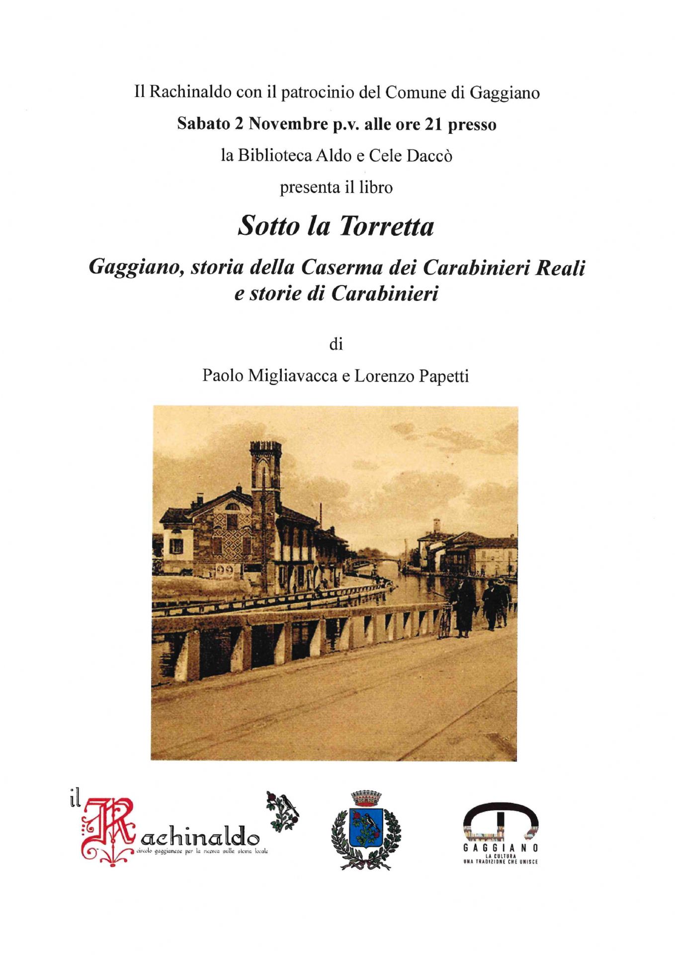 L'Associazione Il Rachinaldo organizza con il patrocinio del Comune di Gaggiano la presentazione del libro "Sotto la Torretta. Storia della caserma dei carabinieri e storia di carabinieri".