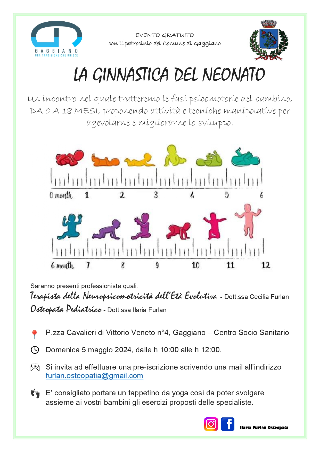 L'iniziativa "LA GINNASTICA DEL NEONATO" si terrà domenica 5 maggio dalle ore 10.00 alle ore 12.00 presso il Centro Socio Sanitario.