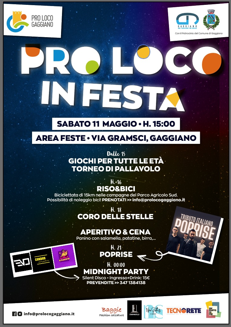 La Pro Loco di Gaggiano organizza, con il patrocinio del Comune di Gaggiano, l'evento "Pro Loco in Festa" in data 11 maggio 2024 dalle ore 15.00 presso l'Area Feste di Via Gramsci.