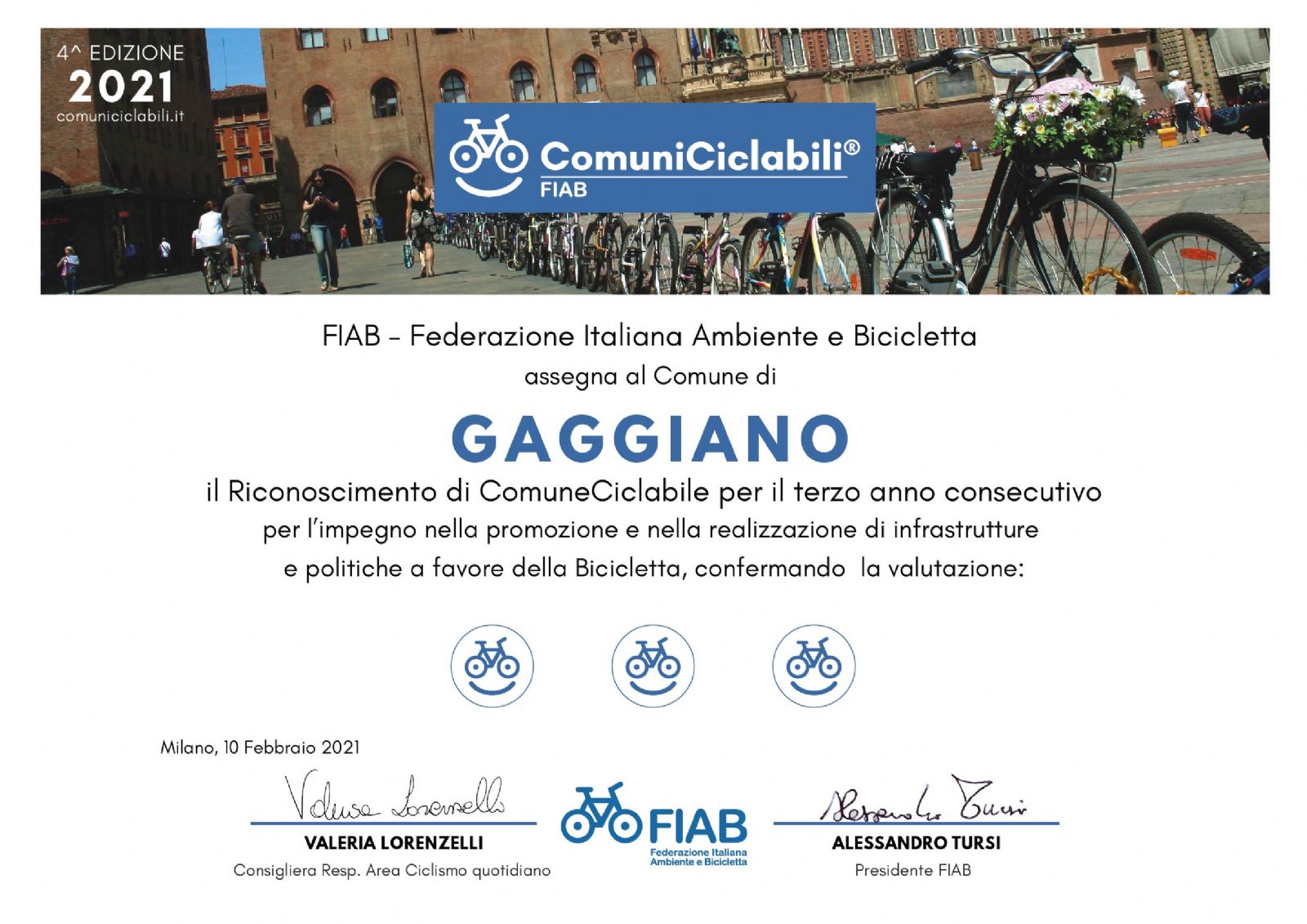 Per il terzo anno consecutivo Gaggiano è comune amico della bicicletta, a conferma che le misure fin qui attuate mantengono e migliorano il grado di ciclabilità del comune, che vedrà un ulteriore miglioramento nei prossimi mesi con il completamento dei lavori in via Roma e altri progetti in fase di sviluppo.