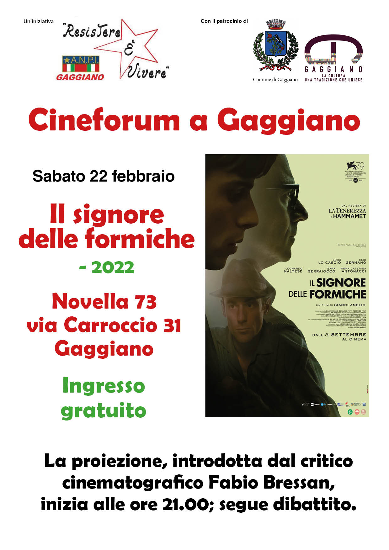 Sabato 22 febbraio alle ore 21.00 presso Circolo La Novella - Via Carroccio 31, Gaggiano cineforum "Il Signore delle Formiche" organizzato da A.N.P.I. Gaggiano con il patrocinio del Comune di Gaggiano.