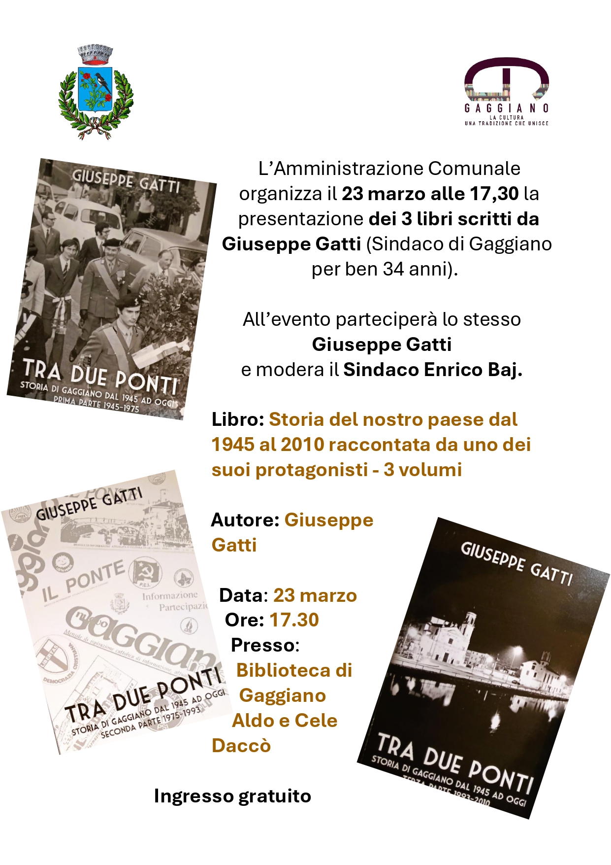 Presentazione sintetica dei volumi: la manifestazione relativa alla presentazione del libro riveste carattere culturale perché Giuseppe Gatti (Sindaco di Gaggiano per ben 34 anni), riferendosi alla sua esperienza politica, racconta personaggi, idee, dibattiti politici intervenuti dal 1945 al 2010 nel territorio di Gaggiano e delle sue frazioni.