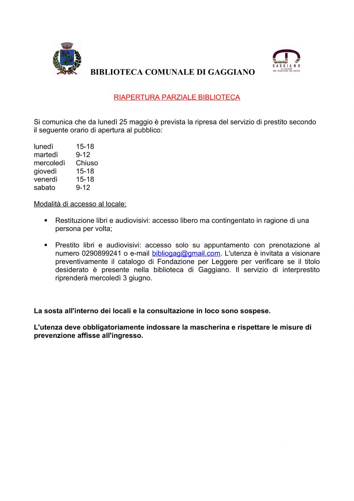 RIAPERTURA PARZIALE BIBLIOTECA COMUNALE