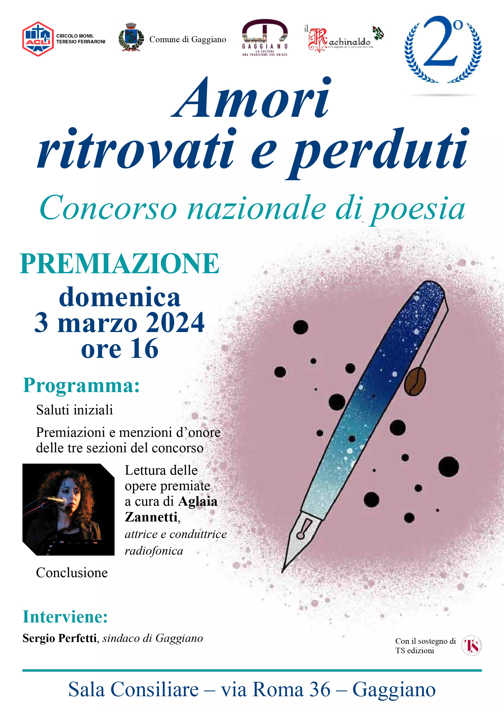 Si svolgerà il 3 marzo alle ore 16, presso la Sala Consiliare del Comune di Gaggiano, la premiazione della seconda edizione del Concorso nazionale di poesia «Città di Gaggiano» (edizione 2023) organizzato dal Circolo Acli “Monsignor Teresio Ferraroni”, con il patrocinio del Comune di Gaggiano, in collaborazione con l'Associazione “Il Rachinaldo”.
