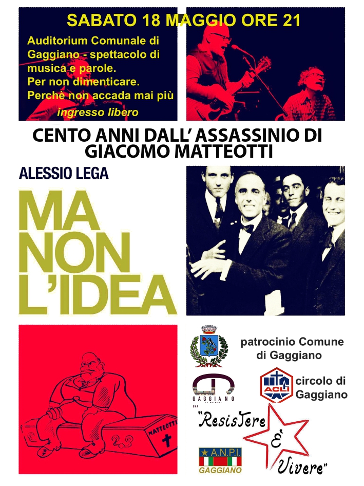 A.N.P.I. Gaggiano organizza, con il patrocinio del Comune di Gaggiano e in collaborazione con ACLI Gaggiano, uno spettacolo di musica e parole in ricordo dell'assassinio di Giacomo Matteotti.