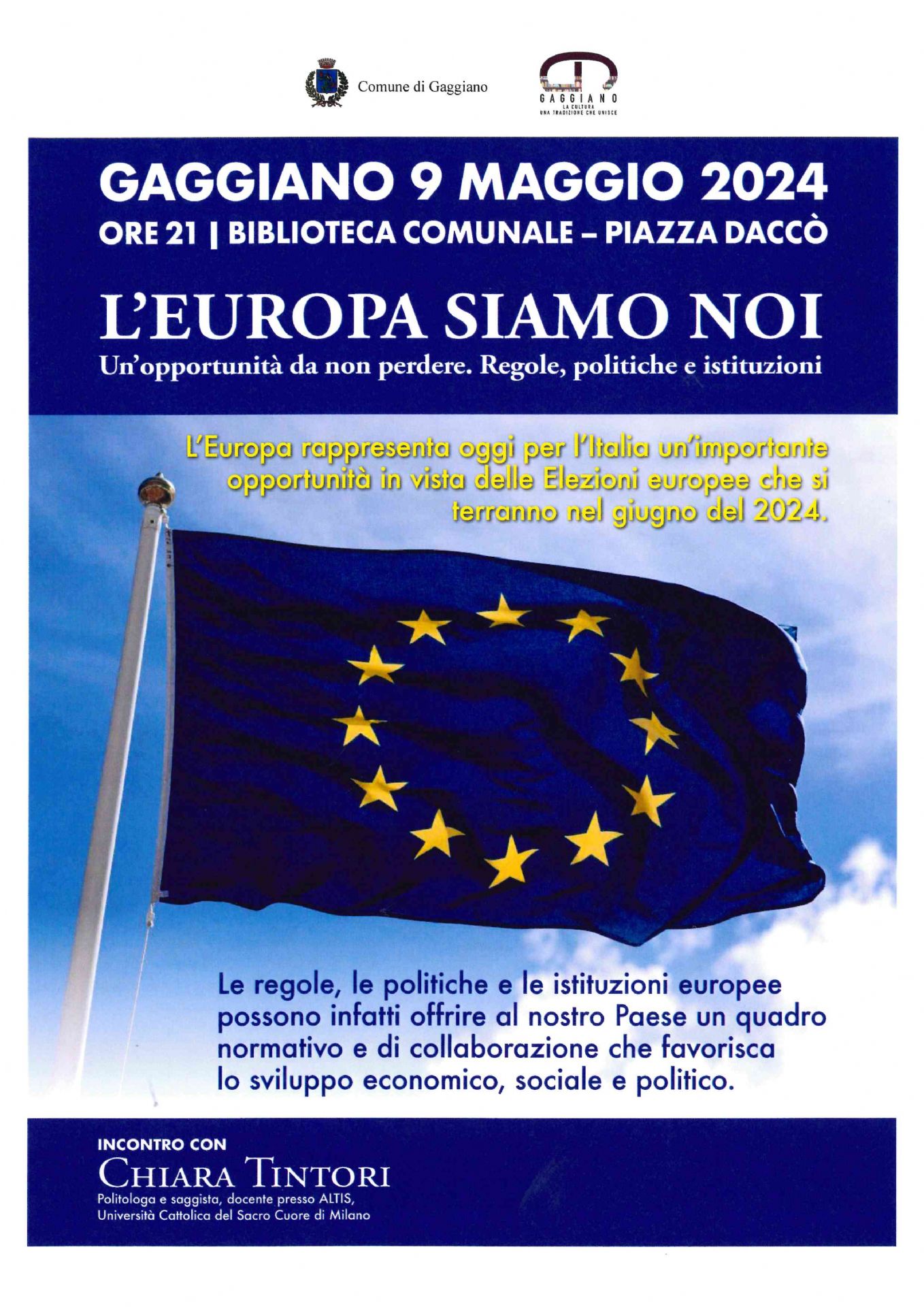 L’Assessorato alla cultura organizza un incontro rivolto a tutta la popolazione dal titolo: “L’EUROPA SIAMO NOI. Un’opportunità da non perdere – Regole, politiche e istituzioni” tenuto dalla Prof.ssa Chiara Tintori, Politologa e saggista, docente presso ALTIS, Università Cattolica del Sacro Cuore di Milano, il 9 maggio 2024 alle ore 21.00 presso la Biblioteca comunale.