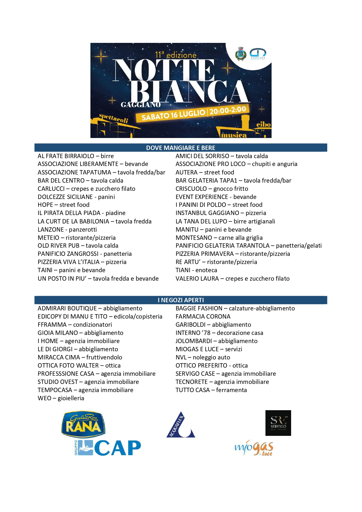 Sabato 16 luglio dalle 20 alle 2 , lungo il Naviglio Grande e per le vie del centro, vi aspetta una serata di musica, spettacoli, cibo, negozi aperti e bancarelle e...a mezzanotte fuochi d'artificio che si riflettono sul nostro splendido naviglio!