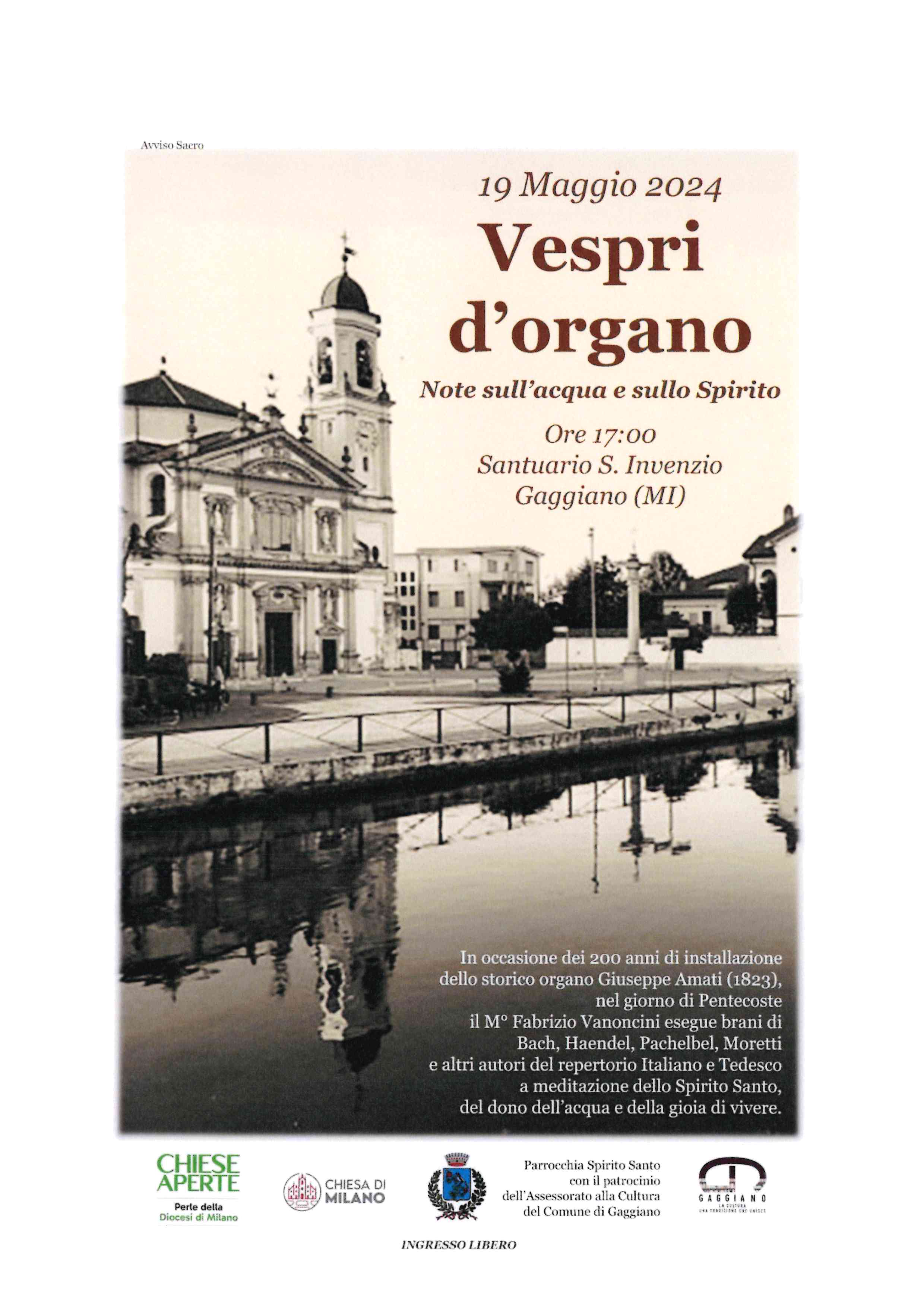 La Parrocchia Spirito Santo con il patrocinio dell'Assessorato alla Cultura del Comune di Gaggiano organizza un concerto in occasione dei duecento anni di installazione dello storico organo Giuseppe Amati (1823).