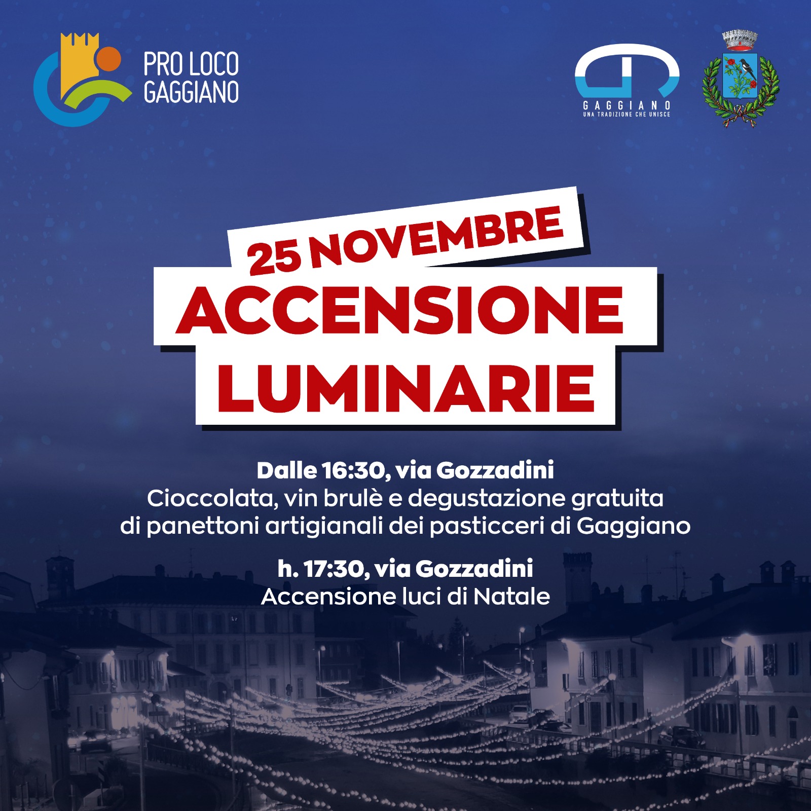 L'Amministrazione Comunale e Pro Loco Gaggiano vi danno appuntamento sabato 25 novembre per la 3° edizione dell'evento "'Accensione delle luminarie", cpn degustazione dei panettoni artigianali offerti dalle pasticcerie gaggianesi che ringraziamo: