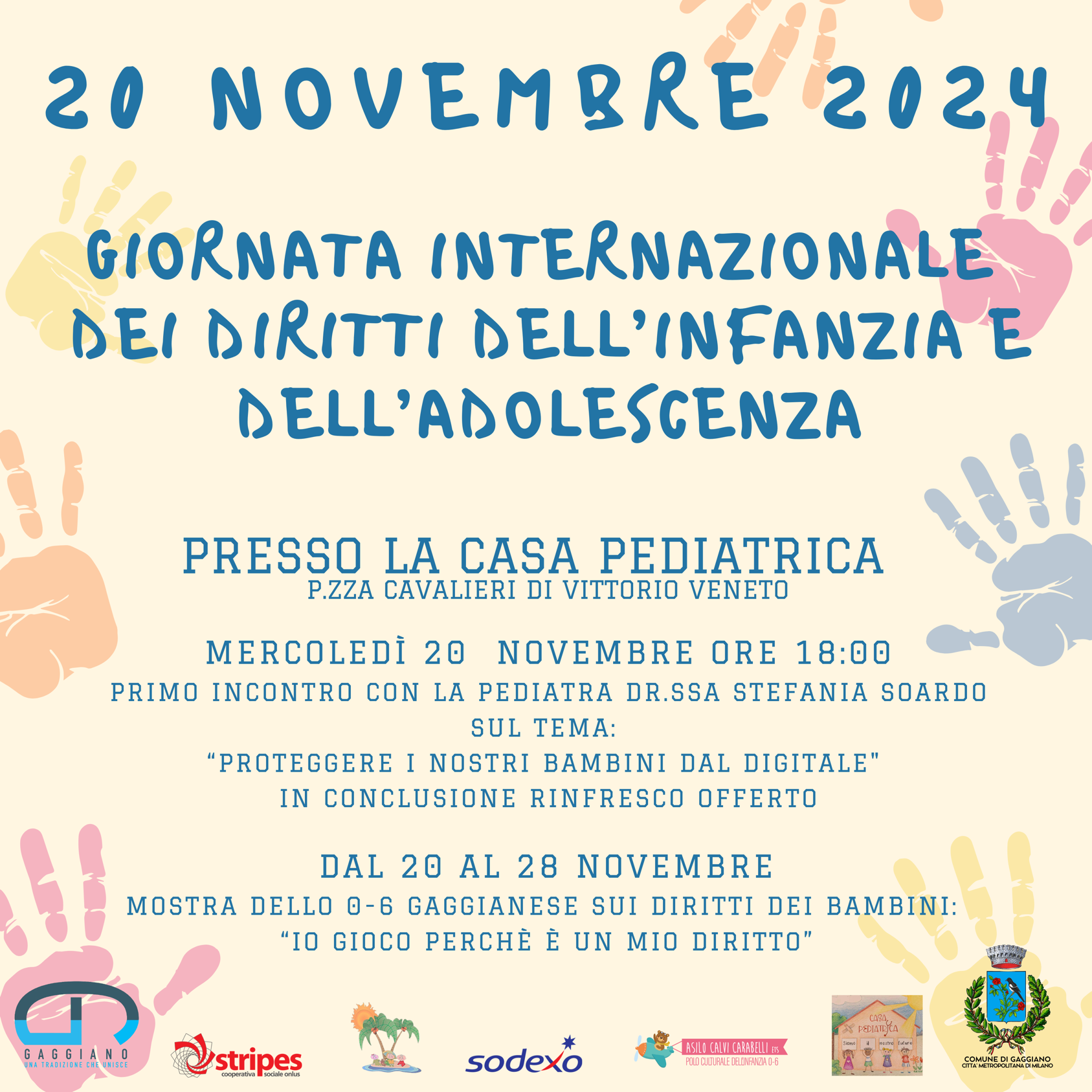 In occasione della 𝐆𝐢𝐨𝐫𝐧𝐚𝐭𝐚 𝐢𝐧𝐭𝐞𝐫𝐧𝐚𝐳𝐢𝐨𝐧𝐚𝐥𝐞 𝐩𝐞𝐫 𝐢 𝐝𝐢𝐫𝐢𝐭𝐭𝐢 𝐝𝐞𝐥𝐥'𝐢𝐧𝐟𝐚𝐧𝐳𝐢𝐚 𝐞 𝐝𝐞𝐥𝐥'𝐚𝐝𝐨𝐥𝐞𝐬𝐜𝐞𝐧𝐳𝐚 sarà dato il via al progetto organizzato dal Comune di Gaggiano in collaborazione con Casa Pediatrica (Dr.ssa Stefania Soardo e Dr.ssa Elena Secco) e con le realtà integrate dello 0-6 Gaggianese (Scuole dell'infanzia paritarie Comunali e Asilo Nido Comunale "Angelo Malabarba", Asilo Nido "Hakuna Matata", Asilo Infantile "Calvi Carabelli ETS").
